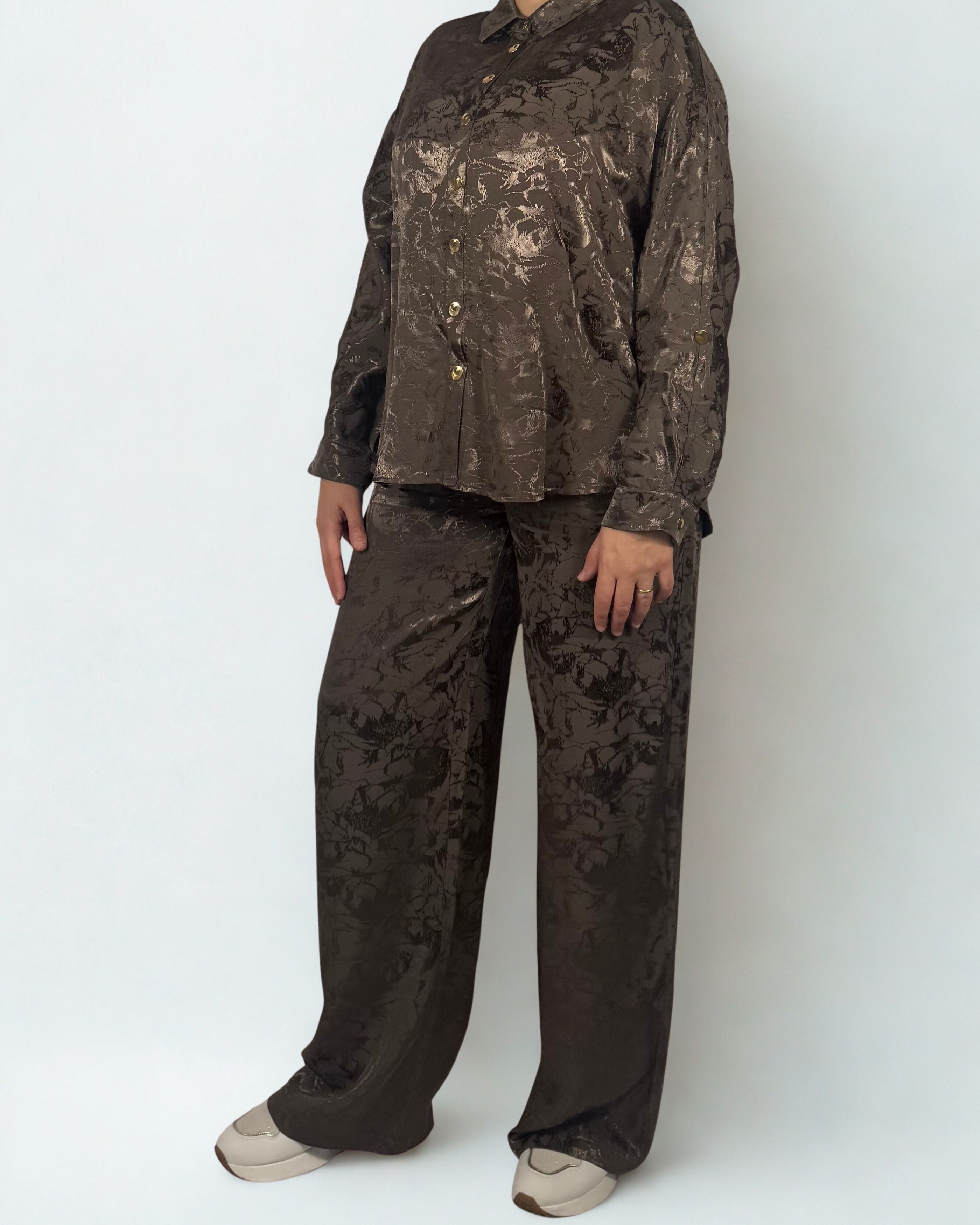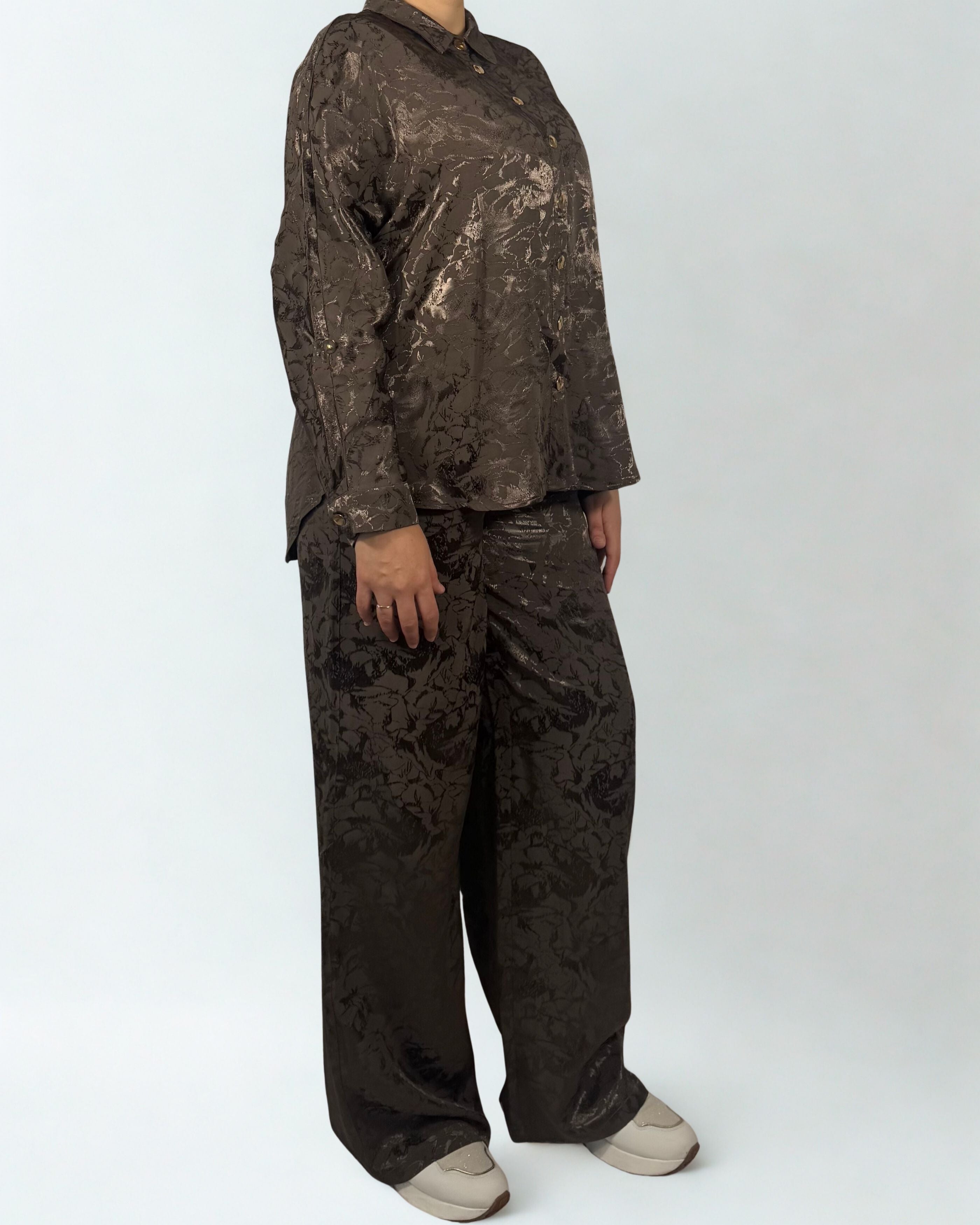 Dieser elegante Zweiteiler aus braunem Stoff mit edlem Marmor-Muster vereint Stil und Komfort auf perfekte Weise. Die Kombination aus Viskose und Baumwolle sorgt für ein besonders weiches und angenehmes Tragegefühl. Das Set, bestehend aus einer schicken Bluse und einem fließend fallenden Hose, bietet eine feminine Silhouette und viel Bewegungsfreiheit – ideal für elegante Anlässe oder stilvolle Alltagslooks. Ein Outfit, das durch seine dezente Musterung und die warme Farbgebung zeitlose Eleganz ausstrahlt.